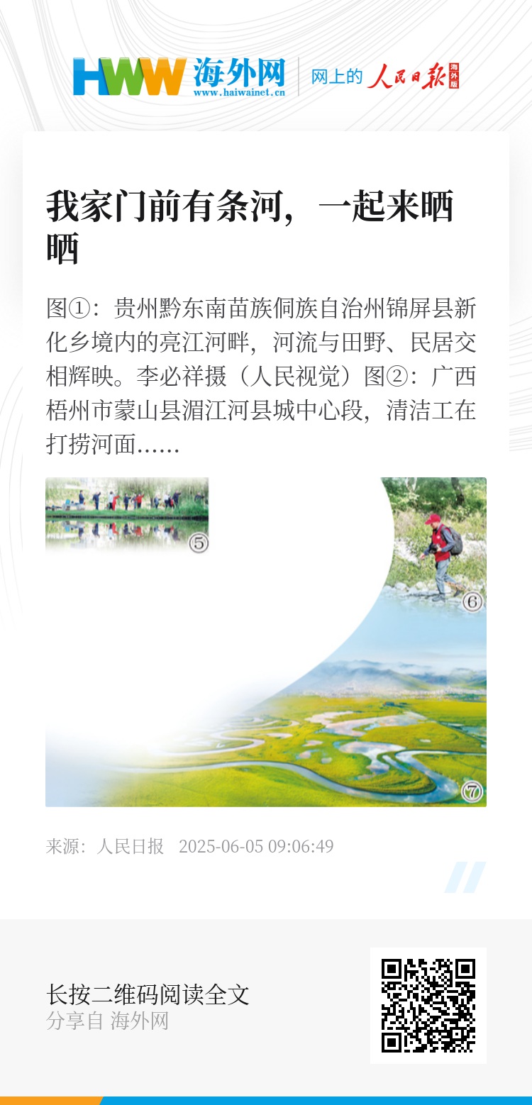 今年是“绿水青山就是金山银山”理念提出20周年,也是“双碳”目标提出5周年。为了生动反映习近平生态文明思想的实践伟力,人民日报经济社会部、地方部、新媒体中心、人民网、《民生周刊》杂志社和生态环境部宣传教育司、水利部河湖管理司,联合推出“我家门前有条河”视觉影像征集及融合报道,请大家晒一晒家门前的美丽河湖、幸福河湖,展现生态环境持续改善的获得感、幸福感。