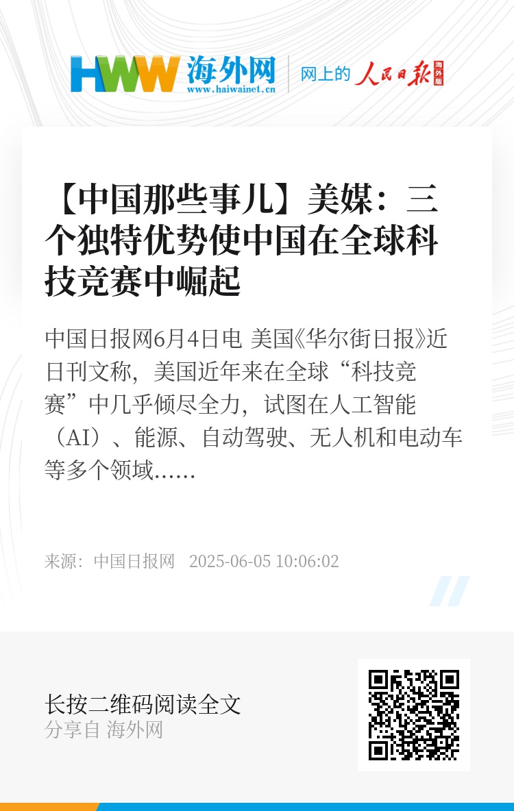 中国日报网6月4日电 美国《华尔街日报》近日刊文称,美国近年来在全球“科技竞赛”中几乎倾尽全力,试图在人工智能(AI)、能源、自动驾驶、无人机和电动车等多个领域压制中国发展。但到目前为止,这些努力均未能奏效。中国科技的发展势头不仅未被美国制裁所遏制,反而在多个关键技术领域加速推进,展现出显著优势。