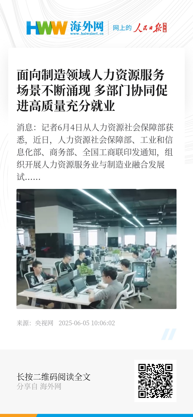 央视网消息:记者6月4日从人力资源社会保障部获悉,近日,人力资源社会保障部、工业和信息化部、商务部、全国工商联印发通知,组织开展人力资源服务业与制造业融合发展试点工作,加快促进高质量充分就业,助力构建现代化产业体系。