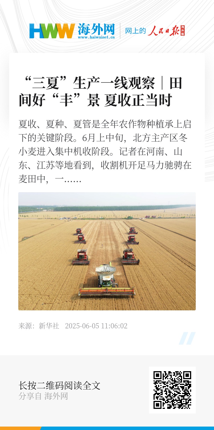 夏收、夏种、夏管是全年农作物种植承上启下的关键阶段。6月上中旬,北方主产区冬小麦进入集中机收阶段。记者在河南、山东、江苏等地看到,收割机开足马力驰骋在麦田中,一排排小麦被整齐地切割、脱粒……广袤农田一片繁忙景象。