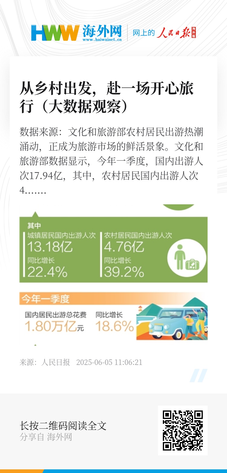 文化和旅游部数据显示,今年一季度,国内出游人次17.94亿,其中,农村居民国内出游人次4.76亿,同比增长39.2%;农村居民出游花费0.32万亿元,同比增长39.6%。两项数据增速均超过城镇居民。