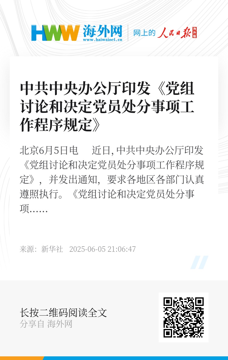 新华社北京6月5日电 近日,中共中央办公厅印发《党组讨论和决定党员处分事项工作程序规定》,并发出通知,要求各地区各部门认真遵照执行。