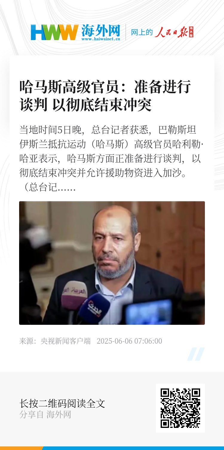 当地时间5日晚,总台记者获悉,巴勒斯坦伊斯兰抵抗运动(哈马斯)高级官员哈利勒·哈亚表示,哈马斯方面正准备进行谈判,以彻底结束冲突并允许援助物资进入加沙。(总台记者 张卓雅)