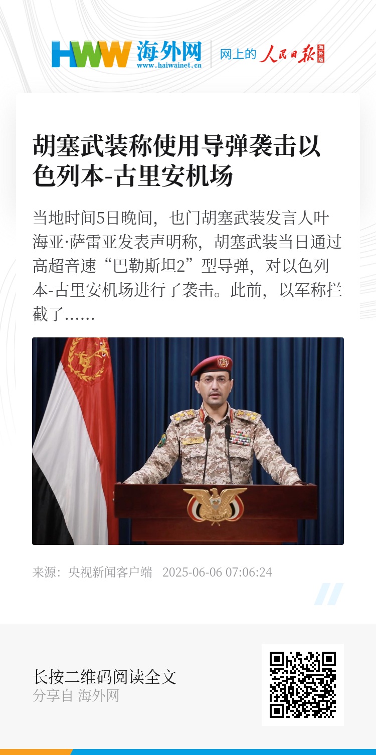 当地时间5日晚间,也门胡塞武装发言人叶海亚·萨雷亚发表声明称,胡塞武装当日通过高超音速“巴勒斯坦2”型导弹,对以色列本-古里安机场进行了袭击。