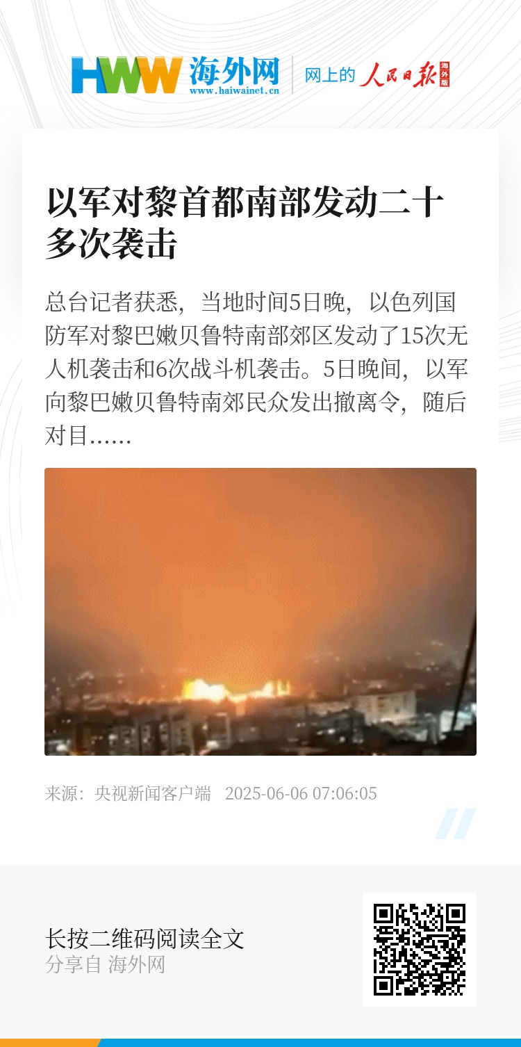 总台记者获悉,当地时间5日晚,以色列国防军对黎巴嫩贝鲁特南部郊区发动了15次无人机袭击和6次战斗机袭击。