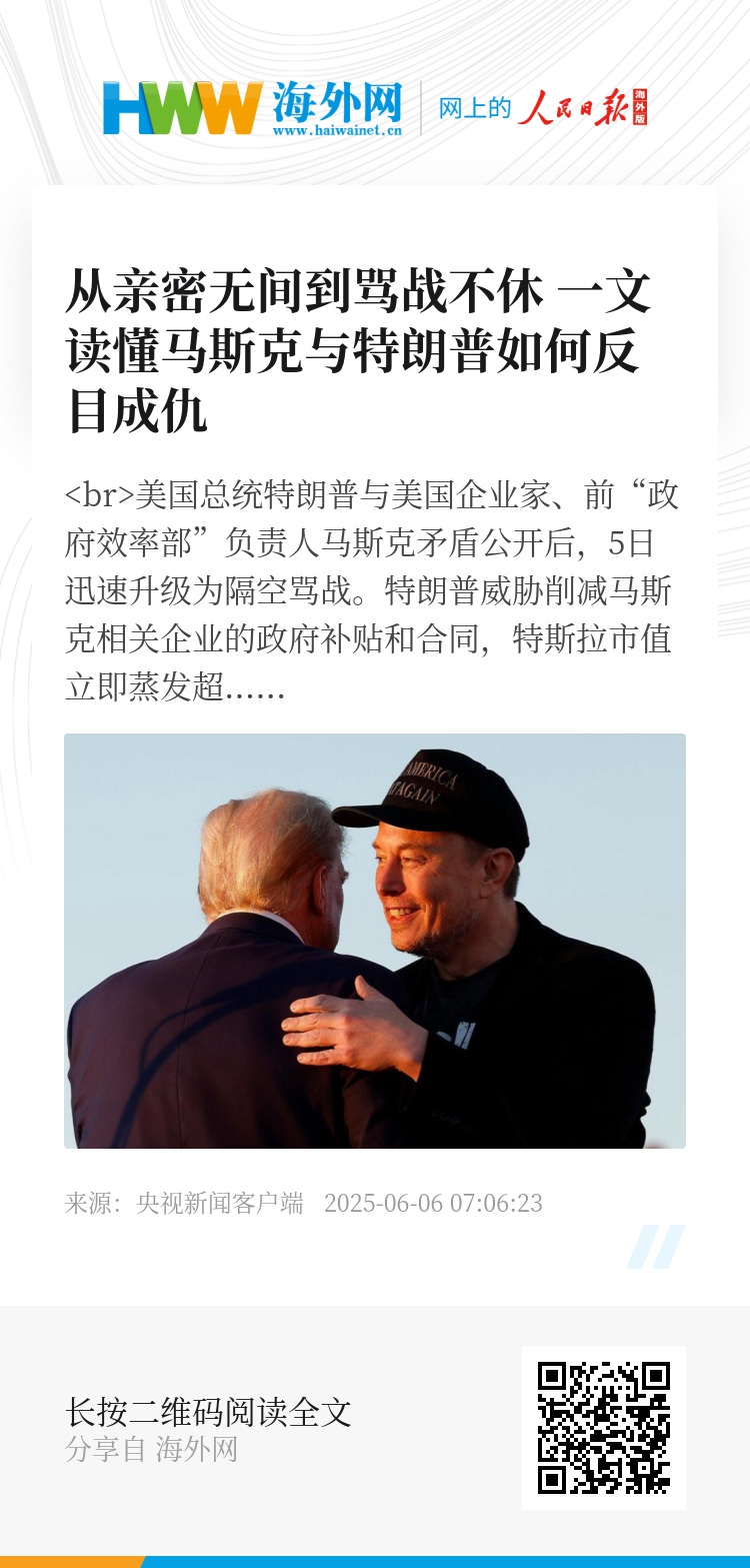 美国总统特朗普与美国企业家、前“政府效率部”负责人马斯克矛盾公开后,5日迅速升级为隔空骂战。