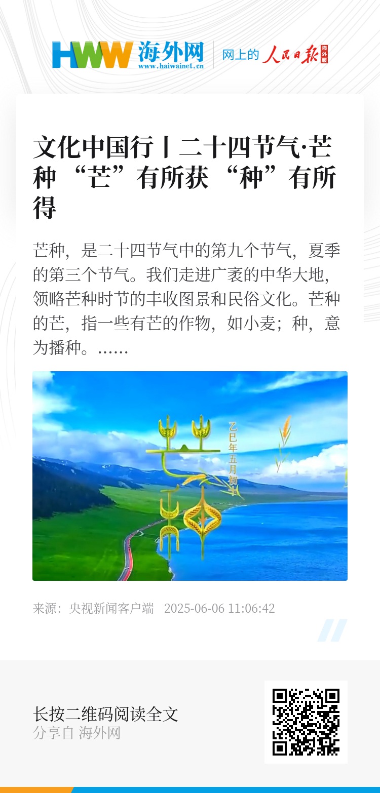 芒种,是二十四节气中的第九个节气,夏季的第三个节气。我们走进广袤的中华大地,领略芒种时节的丰收图景和民俗文化。