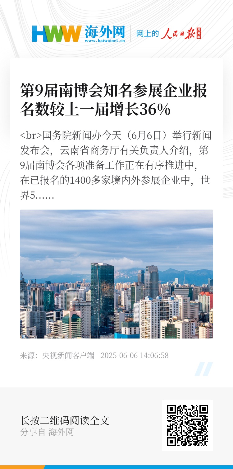 国务院新闻办今天(6月6日)举行新闻发布会,云南省商务厅有关负责人介绍,第9届南博会各项准备工作正在有序推进中,在已报名的1400多家境内外参展企业中,世界500强、中国500强等知名企业、行业龙头达120余家,较上一届增长36%。