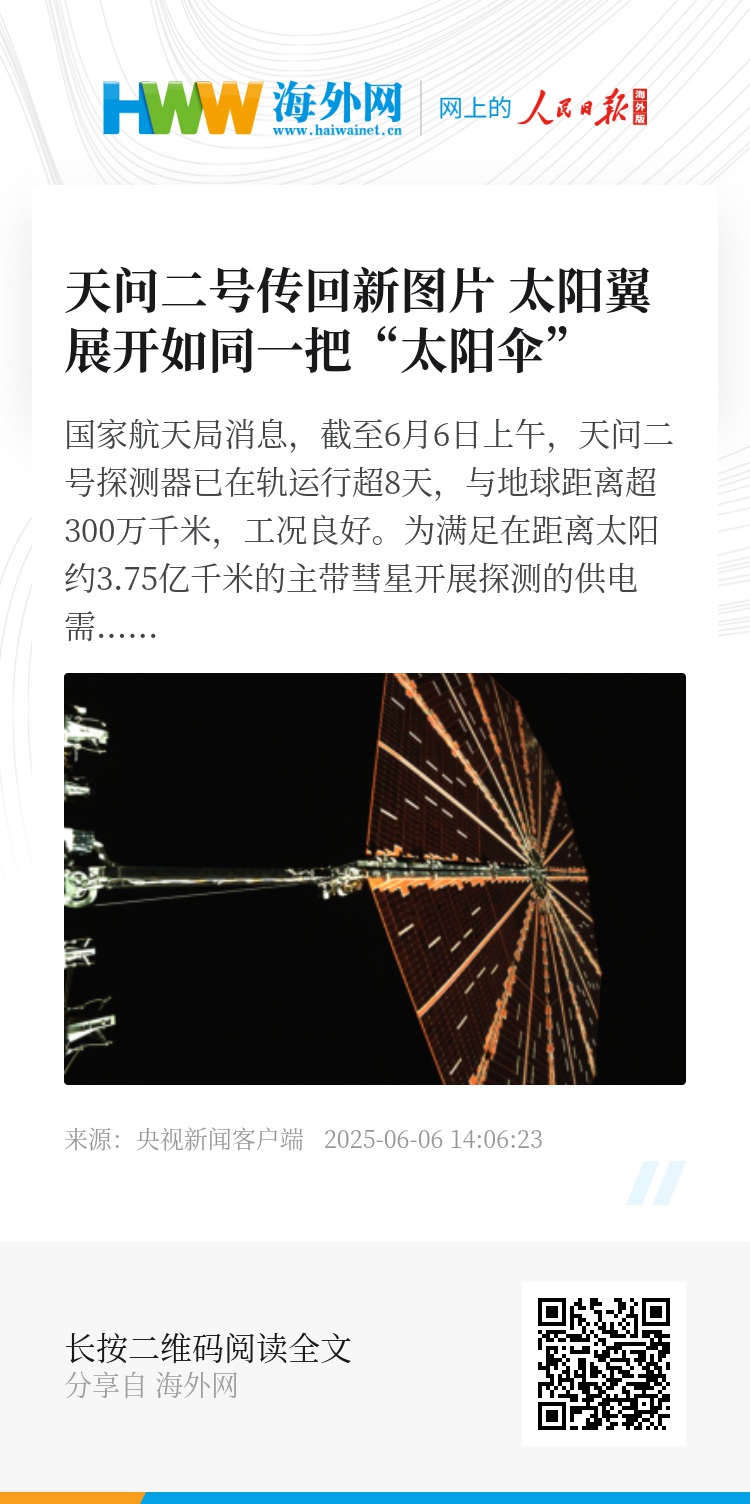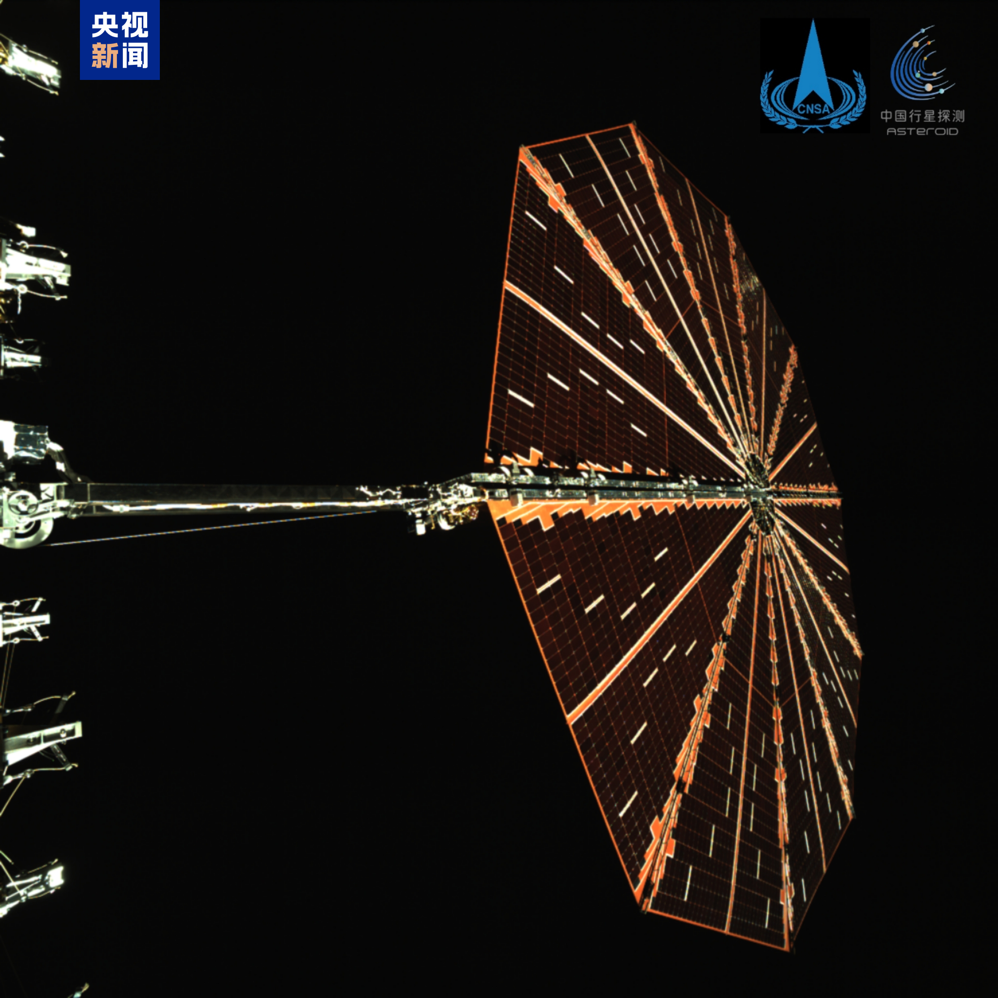 国家航天局消息,截至6月6日上午,天问二号探测器已在轨运行超8天,与地球距离超300万千米,工况良好。为满足在距离太阳约3.75亿千米的主带彗星开展探测的供电需求,天问二号探测器研发配置了圆形柔性太阳翼。国家航天局还发布了天问二号探测器传回的圆形太阳翼展开的图片。