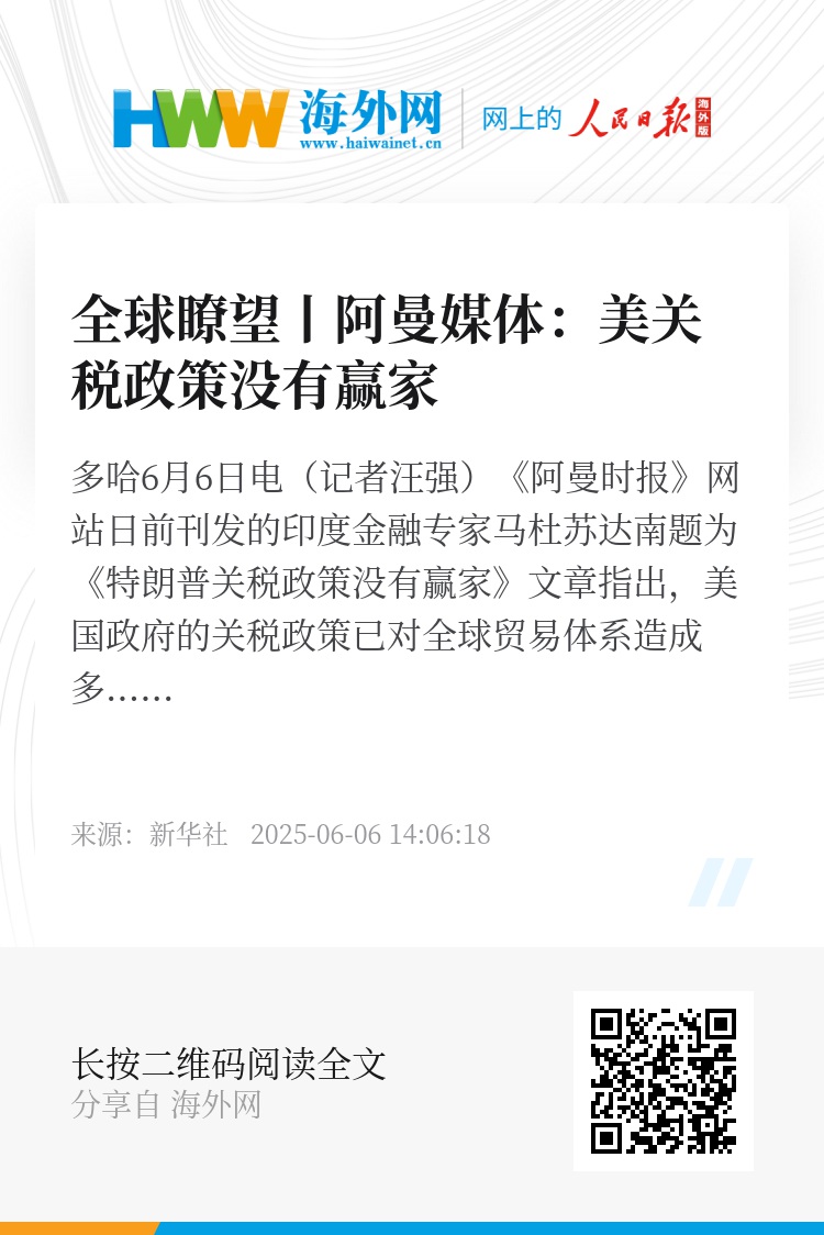 新华社多哈6月6日电(记者汪强)《阿曼时报》网站日前刊发的印度金融专家马杜苏达南题为《特朗普关税政策没有赢家》文章指出,美国政府的关税政策已对全球贸易体系造成多层次冲击,破坏了既有供应链,拖累了全球经济增长。摘要如下: