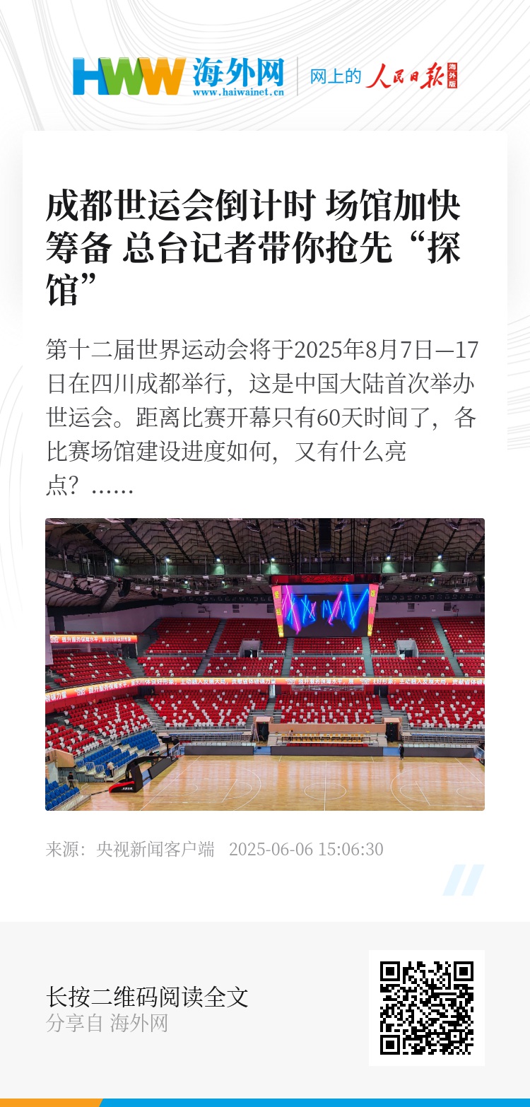 第十二届世界运动会将于2025年8月7日—17日在四川成都举行,这是中国大陆首次举办世运会。距离比赛开幕只有60天时间了,各比赛场馆建设进度如何,又有什么亮点?日前,总台记者走入部分成熟场馆内,探访了赛事准备的各项情况。