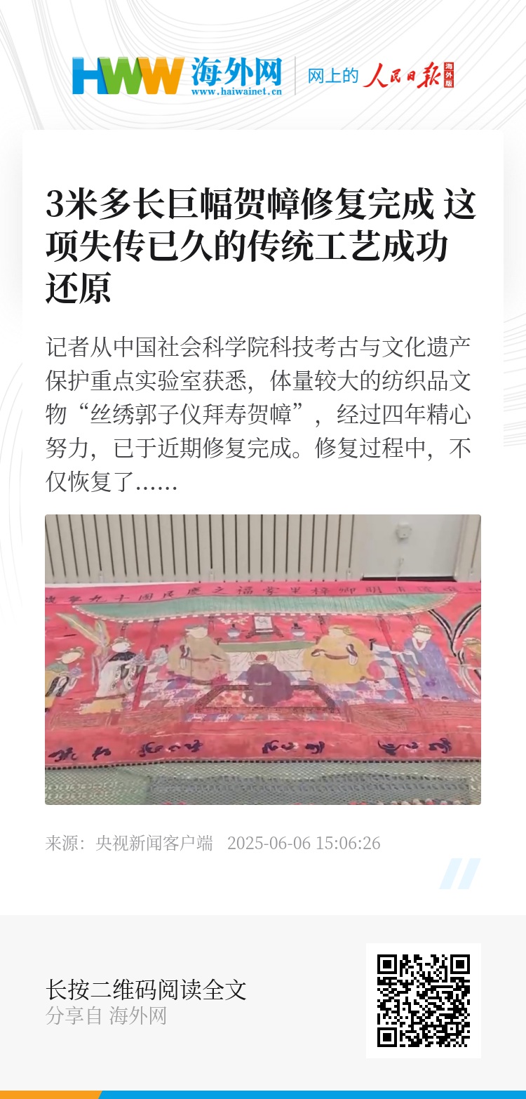 记者从中国社会科学院科技考古与文化遗产保护重点实验室获悉,体量较大的纺织品文物“丝绣郭子仪拜寿贺幛”,经过四年精心努力,已于近期修复完成。修复过程中,不仅恢复了文物原貌,文保专家还成功还原出一项失传已久的传统工艺。