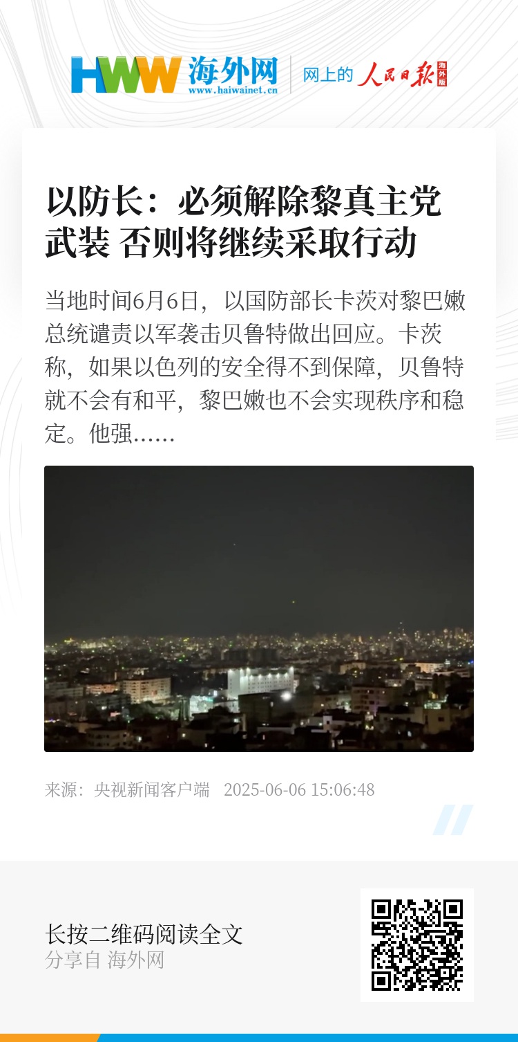 当地时间6月6日,以国防部长卡茨对黎巴嫩总统谴责以军袭击贝鲁特做出回应。卡茨称,如果以色列的安全得不到保障,贝鲁特就不会有和平,黎巴嫩也不会实现秩序和稳定。他强调,以黎停火协议必须得到尊重,如果黎巴嫩方面不履行应尽的责任,以色列将继续采取强有力的行动。他同时指出,黎巴嫩政府必须解除黎真主党的武装,不能允许其制造对以色列构成威胁的无人机。