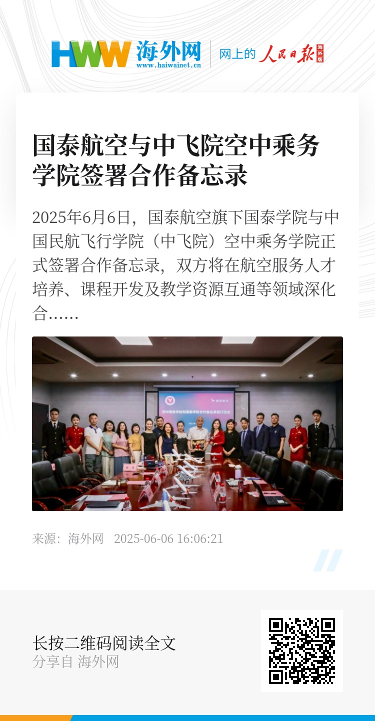 2025年6月6日,国泰航空旗下国泰学院与中国民航飞行学院(中飞院)空中乘务学院正式签署合作备忘录,双方将在航空服务人才培养、课程开发及教学资源互通等领域深化合作。国泰学院总监郑悦、中飞院空中乘务学院院长姚建明等代表出席签约仪式。