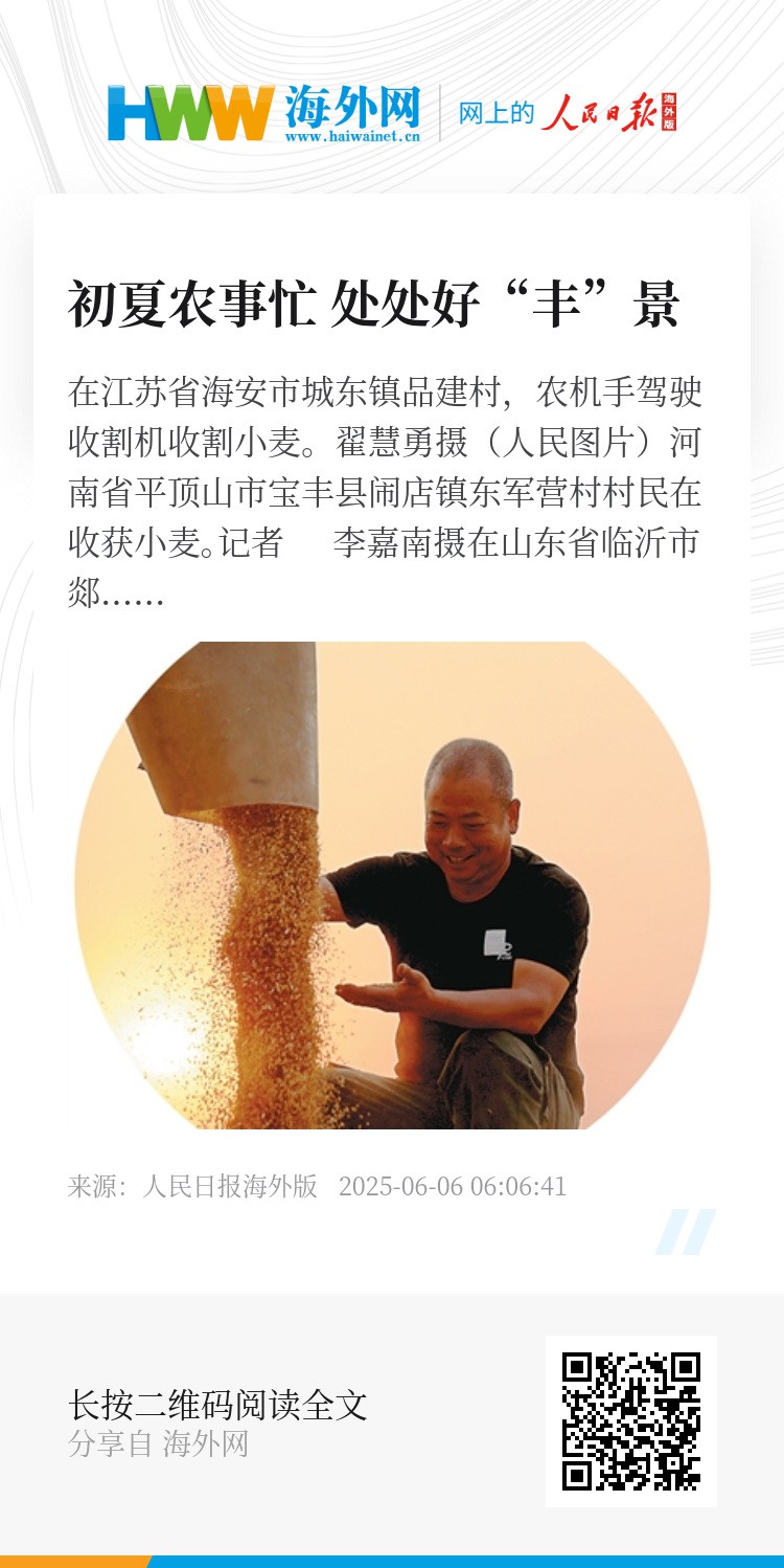 据人民网报道,今年“三夏”全国投入各类农机具超1700万台(套),压茬推进夏收、夏种和夏管机械化作业。其中,每秒9—10公斤大喂入量联合收割机已成为跨区作业主流机型,配备北斗定位、作业监测等功能的智能化联合收割机更多投入生产一线,将为机收快速高效推进提供有力支撑。网友“看雪”评论说,“机器收粮,效率翻倍,现代化力量,让农业焕发新生。”