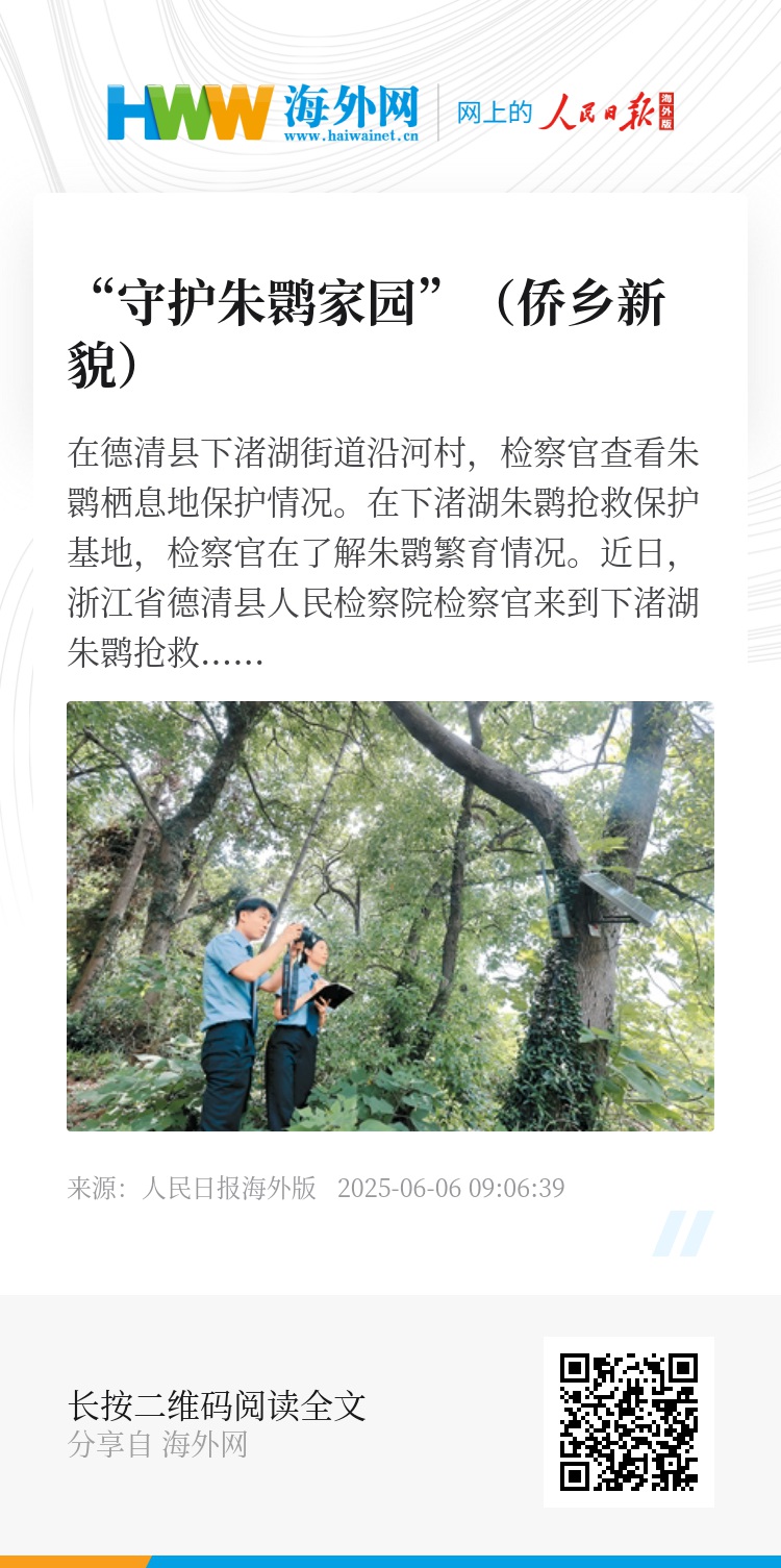 近日,浙江省德清县人民检察院检察官来到下渚湖朱鹮抢救保护基地,开展“守护朱鹮家园”普法宣传和公益诉讼“回头看”活动。每年3月至6月是国家一级保护动物朱鹮的繁育季节,德清县人民检察院通过普法宣传、实地勘查、法治教育等多元形式,提高群众的野生动物保护意识。