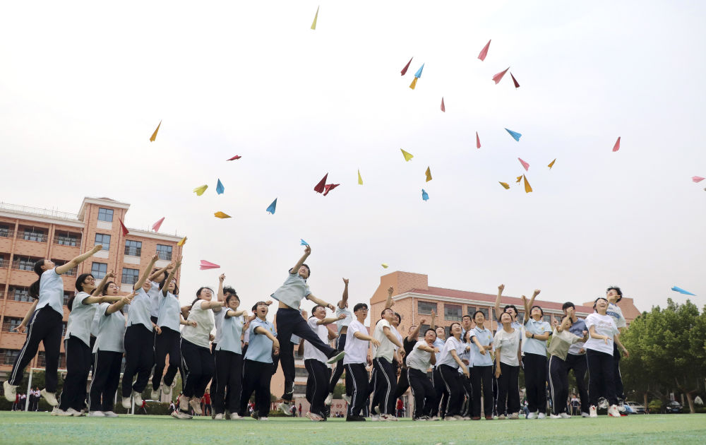 5月22日,在山东省高密市第五中学,高三学生将写有梦想的纸飞机抛向空中。