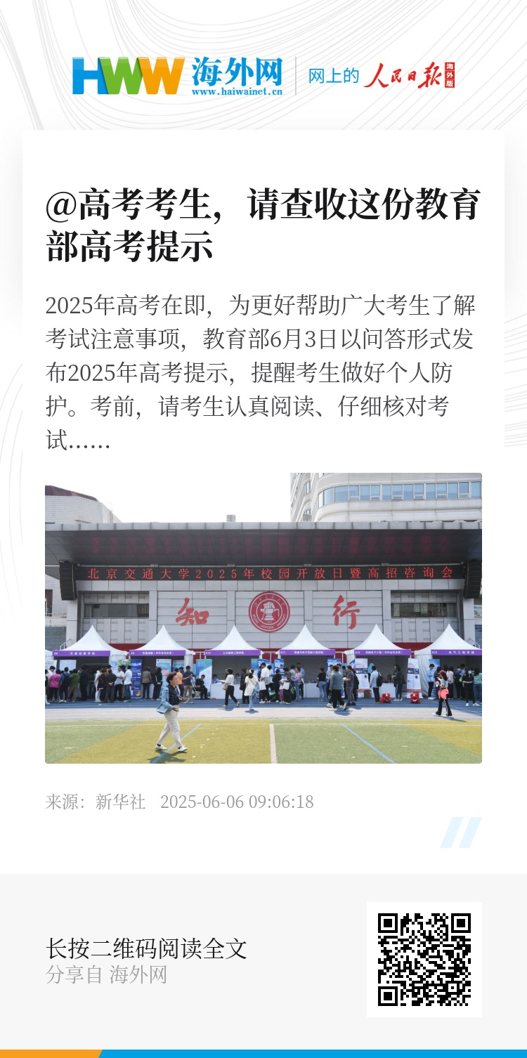 2025年高考在即,为更好帮助广大考生了解考试注意事项,教育部6月3日以问答形式发布2025年高考提示,提醒考生做好个人防护。