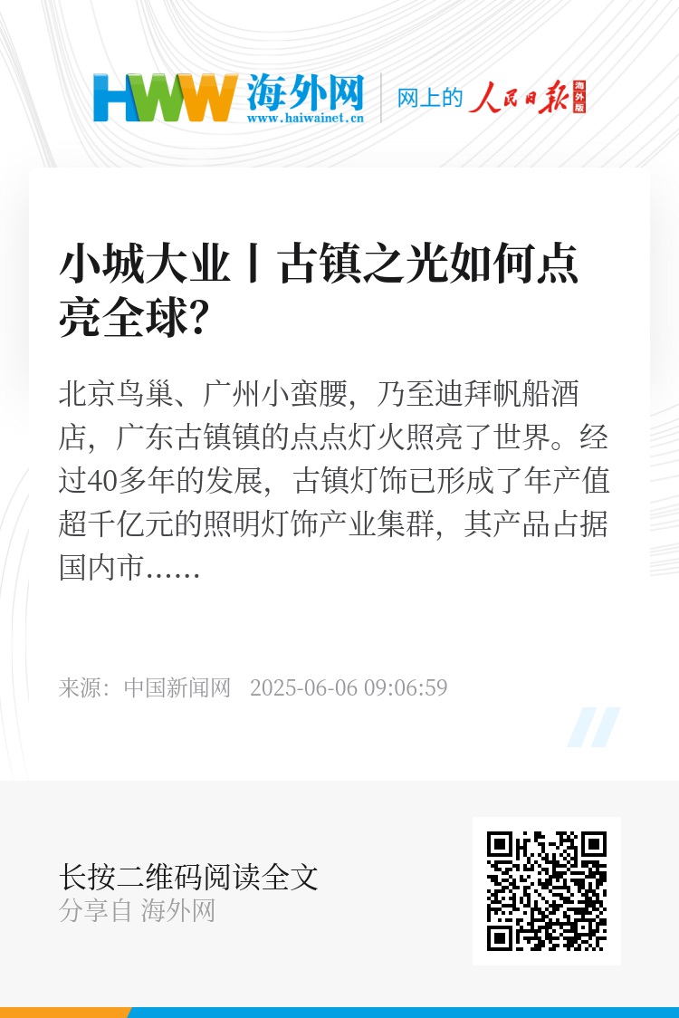 北京鸟巢、广州小蛮腰,乃至迪拜帆船酒店,广东古镇镇的点点灯火照亮了世界。经过40多年的发展,古镇灯饰已形成了年产值超千亿元的照明灯饰产业集群,其产品占据国内市场70%份额,还远销180多个国家和地区。从无到有、从小到大,从一个名不见经传的小镇成为全球灯饰市场的心脏,古镇的光再次点亮想象力,用场景、氛围、创新深度融入日常生活,依靠应用端的技术升级和产品端的差异化开辟出一条光明之路。