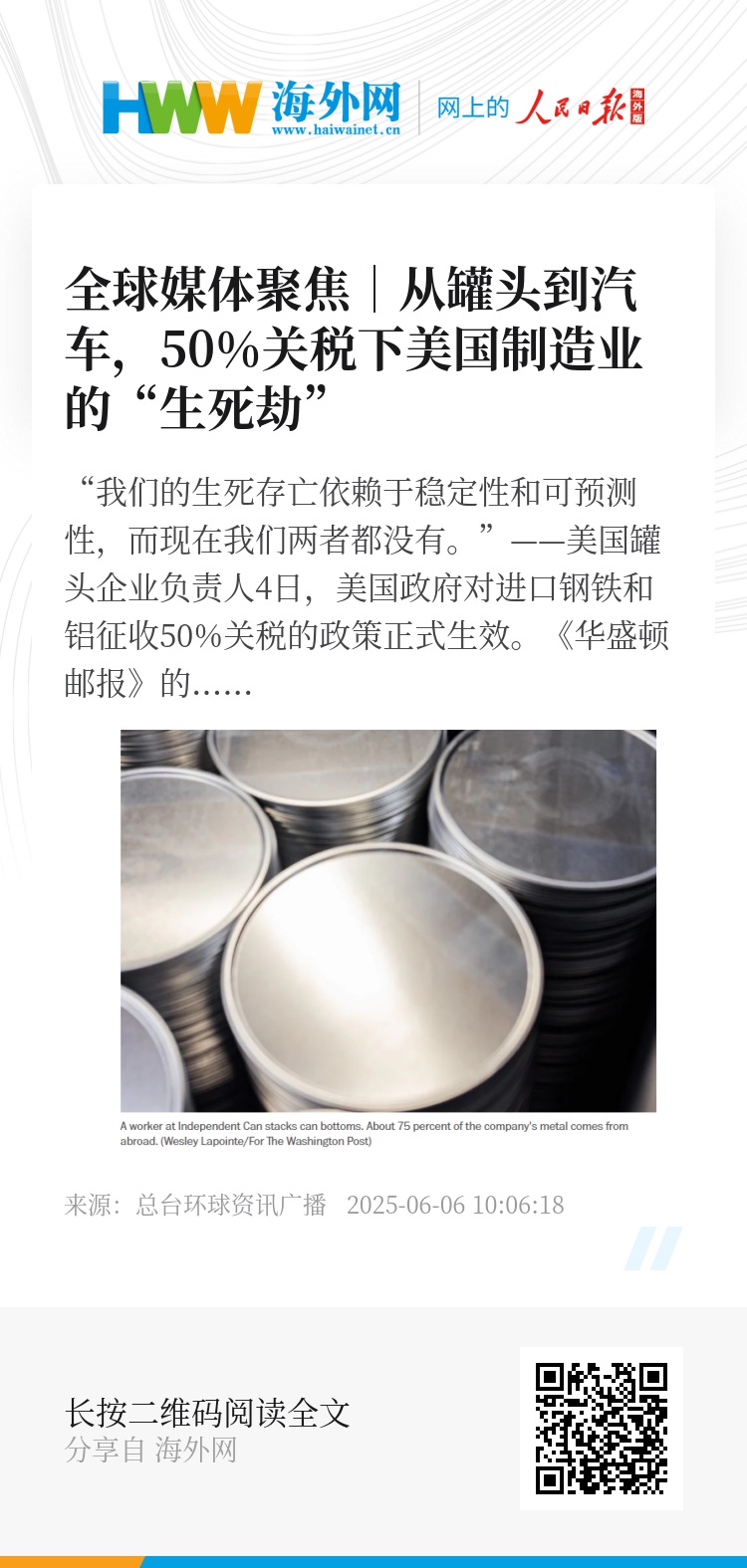 报道以一家美国罐头公司为例,称加征关税将使其在马里兰州和俄亥俄州的工厂生产婴儿配方奶粉、咖啡、爆米花和狗粮罐头的成本上升。此前,这家公司已经上调了价格,以抵消美国政府2月宣布的25%钢铁和铝关税的部分影响。现在,随着关税上涨至50%,该公司负责人表示将不得不转嫁更多的费用。