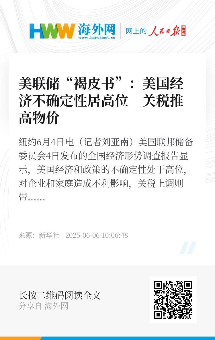 新华社纽约6月4日电(记者刘亚南)美国联邦储备委员会4日发布的全国经济形势调查报告显示,美国经济和政策的不确定性处于高位,对企业和家庭造成不利影响,关税上调则带来成本和物价上涨压力。