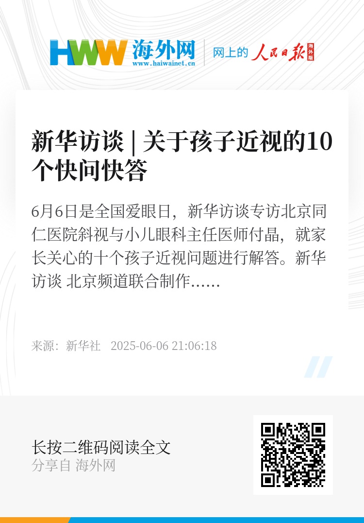 6月6日是全国爱眼日,新华访谈专访北京同仁医院斜视与小儿眼科主任医师付晶,就家长关心的十个孩子近视问题进行解答。
