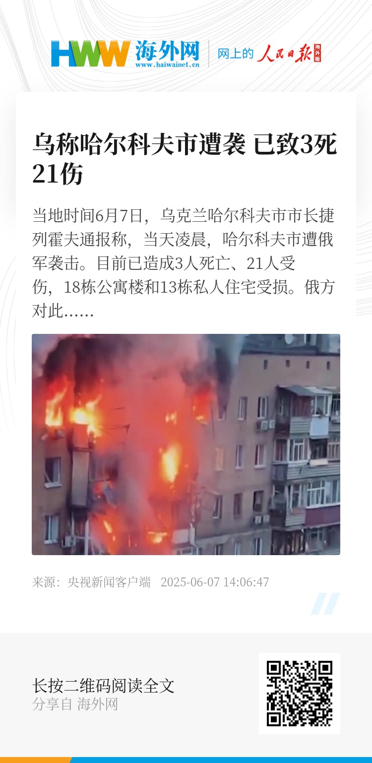 当地时间6月7日,乌克兰哈尔科夫市市长捷列霍夫通报称,当天凌晨,哈尔科夫市遭俄军袭击。目前已造成3人死亡、21人受伤,18栋公寓楼和13栋私人住宅受损。