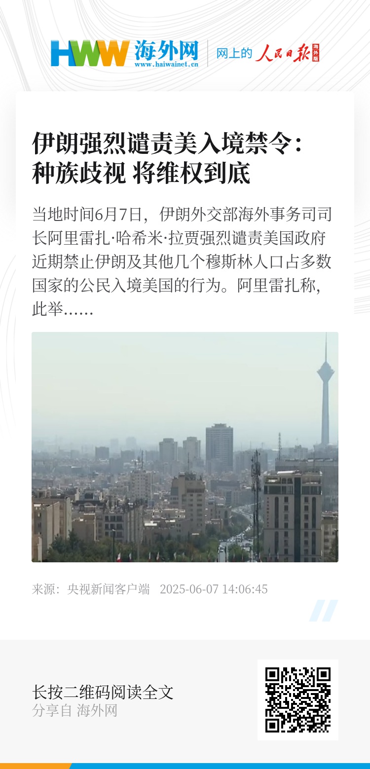 当地时间6月7日,伊朗外交部海外事务司司长阿里雷扎·哈希米·拉贾强烈谴责美国政府近期禁止伊朗及其他几个穆斯林人口占多数国家的公民入境美国的行为。