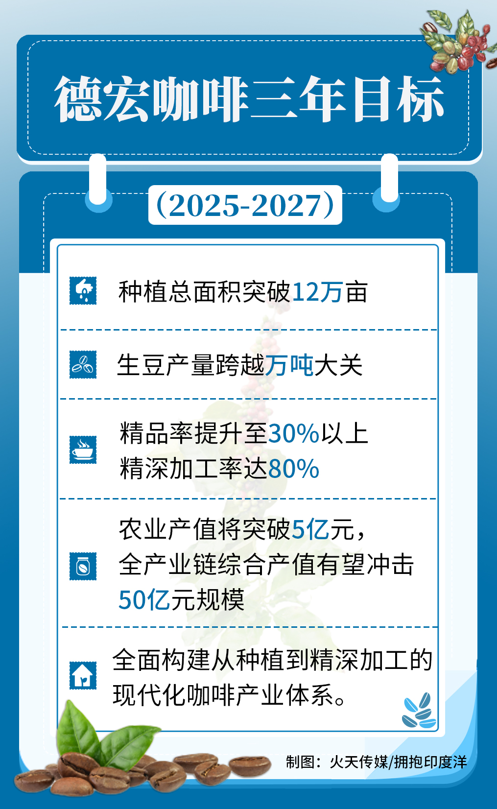 为推动产业升级,《德宏州咖啡产业高质量发展三年行动方案(2025-2027年)》明确提出:在保持现有8.17万亩种植规模的基础上,未来三年计划新增种植面积4.2万亩,力争到2027年实现四大突破性目标——种植总面积突破12万亩,生豆产量跨越万吨大关,精品率提升至30%以上,精深加工率达80%,农业产值将突破5亿元,全产业链综合产值有望冲击50亿元规模,全面构建从种植到精深加工的现代化咖啡产业体系。