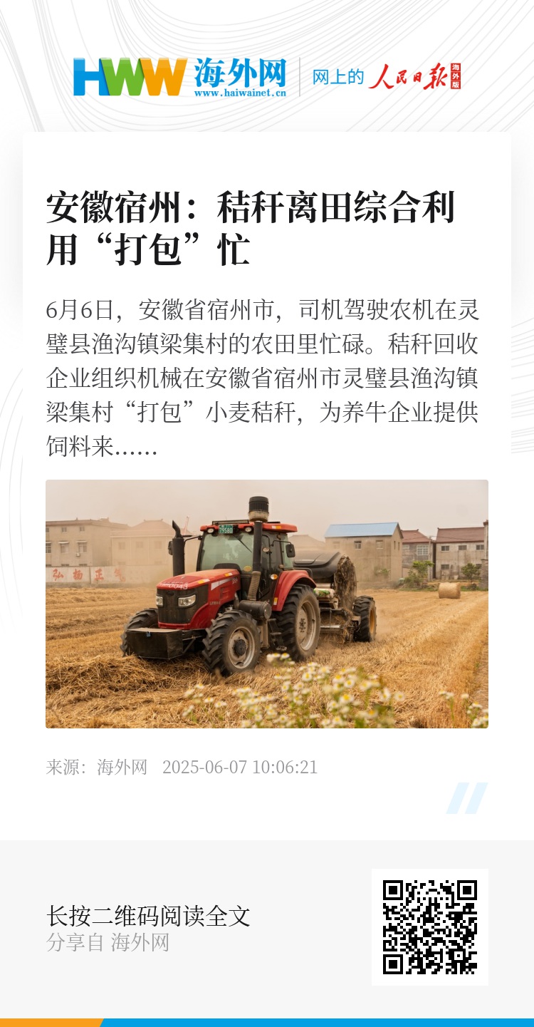 6月6日,安徽省宿州市,司机驾驶农机在灵璧县渔沟镇梁集村的农田里忙碌。秸秆回收企业组织机械在安徽省宿州市灵璧县渔沟镇梁集村“打包”小麦秸秆,为养牛企业提供饲料来源。图源:IC photo