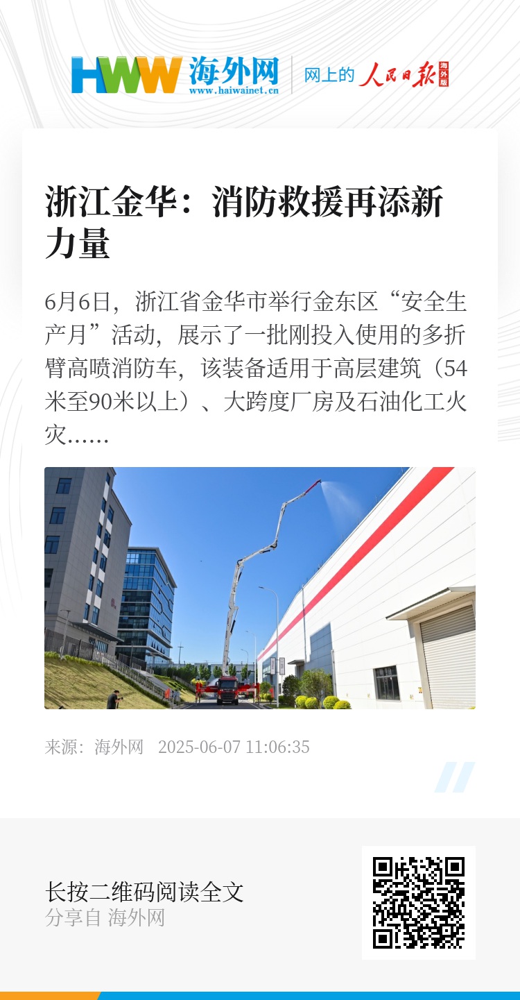 6月6日,浙江省金华市举行金东区“安全生产月”活动,展示了一批刚投入使用的多折臂高喷消防车,该装备适用于高层建筑(54米至90米以上)、大跨度厂房及石油化工火灾场景,通过俯射灭火降低内攻风险,也可以有效辅助救援人员对外部火势进行控制,防止火势蔓延。图源:IC photo