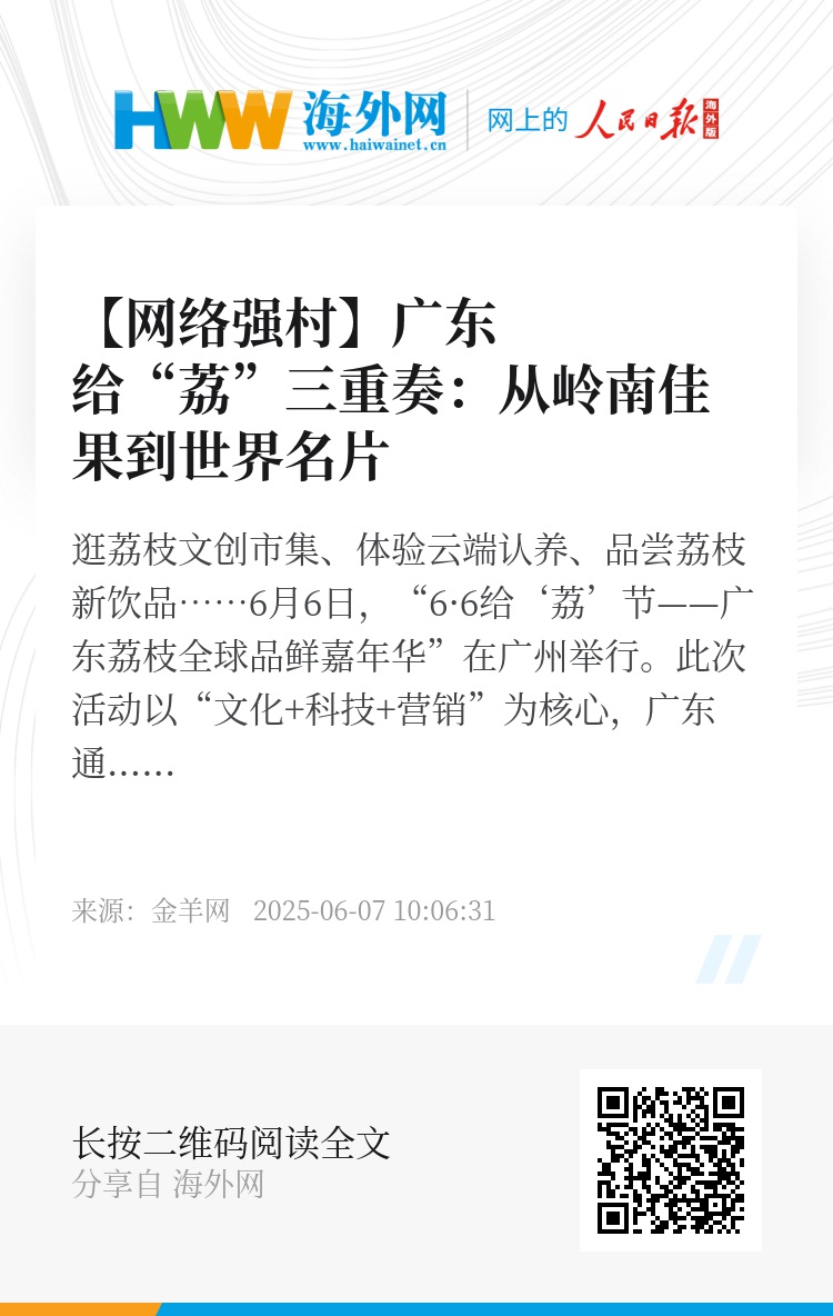 从岭南佳果到世界名片,从行“鲜”全国到风靡全球,广东的给“荔”三重奏,本质上是广东特色农业现代化发展的创新实践——以科技锁定“鲜度”,以创意提升“热度”,以开放拓展“广度”,推动荔枝产业从规模优倩势向价值优势升级。这份给“荔”,给的是荔枝丰产、荔农增收的底气,更是“百千万工程”赋能下广东荔枝产业高质量发展的无限可能。(李妹妍)