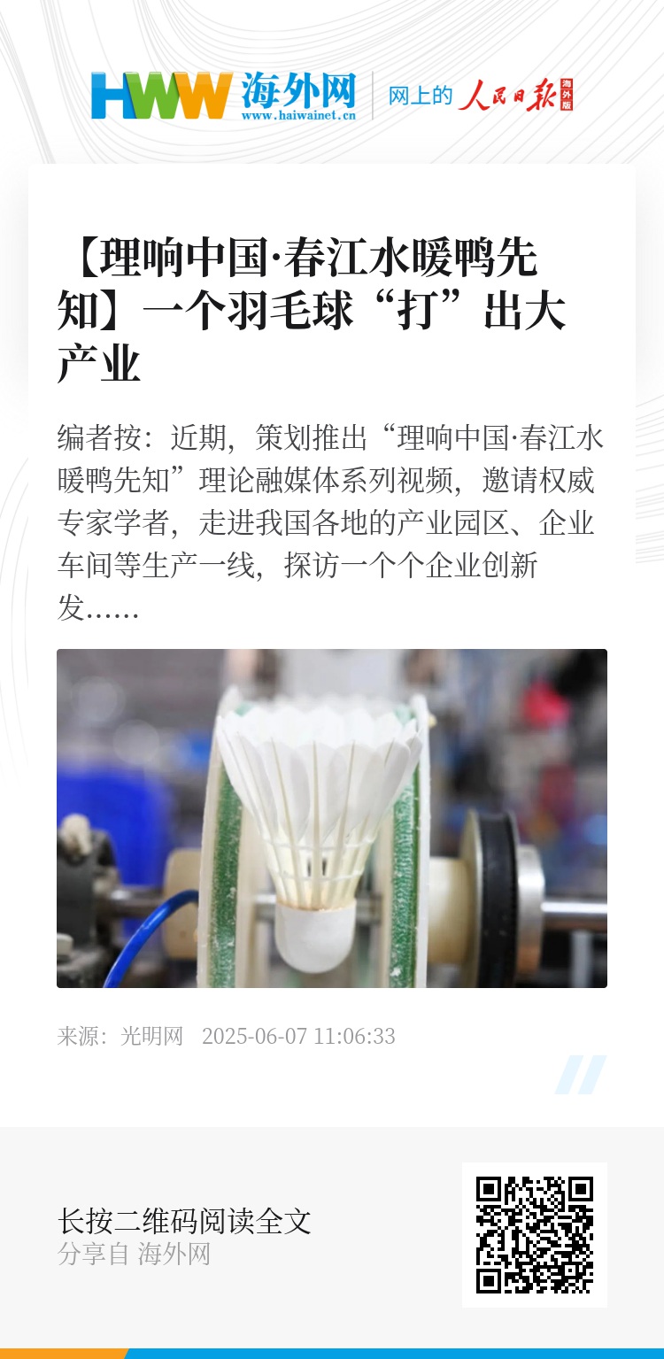 编者按:近期,光明网策划推出“理响中国·春江水暖鸭先知”理论融媒体系列视频,邀请权威专家学者,走进我国各地的产业园区、企业车间等生产一线,探访一个个企业创新发展的生动故事,共同探寻我国经济发展的新动能、好经验。本期视频,中央党校(国家行政学院)社会和生态文明教研部教授胡颖廉走访贵州黔东南锦屏县,探访一个偏远的山区县如何造出全球十分之一的羽毛球。