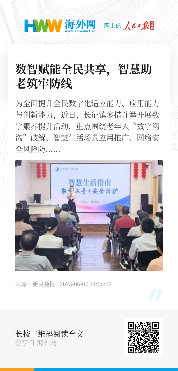 此次活动的开展,不仅让老年人感受到了数字时代的温暖与便利,也进一步增强了全民网络安全意识,为普陀区数字素养与技能提升工作贡献了“长征力量”。6月上旬,长征镇老龄办将联合镇党群办开展“长者智能技术运用能力提升行动”,活动以“高校+企业+社区”的形式进行授课。