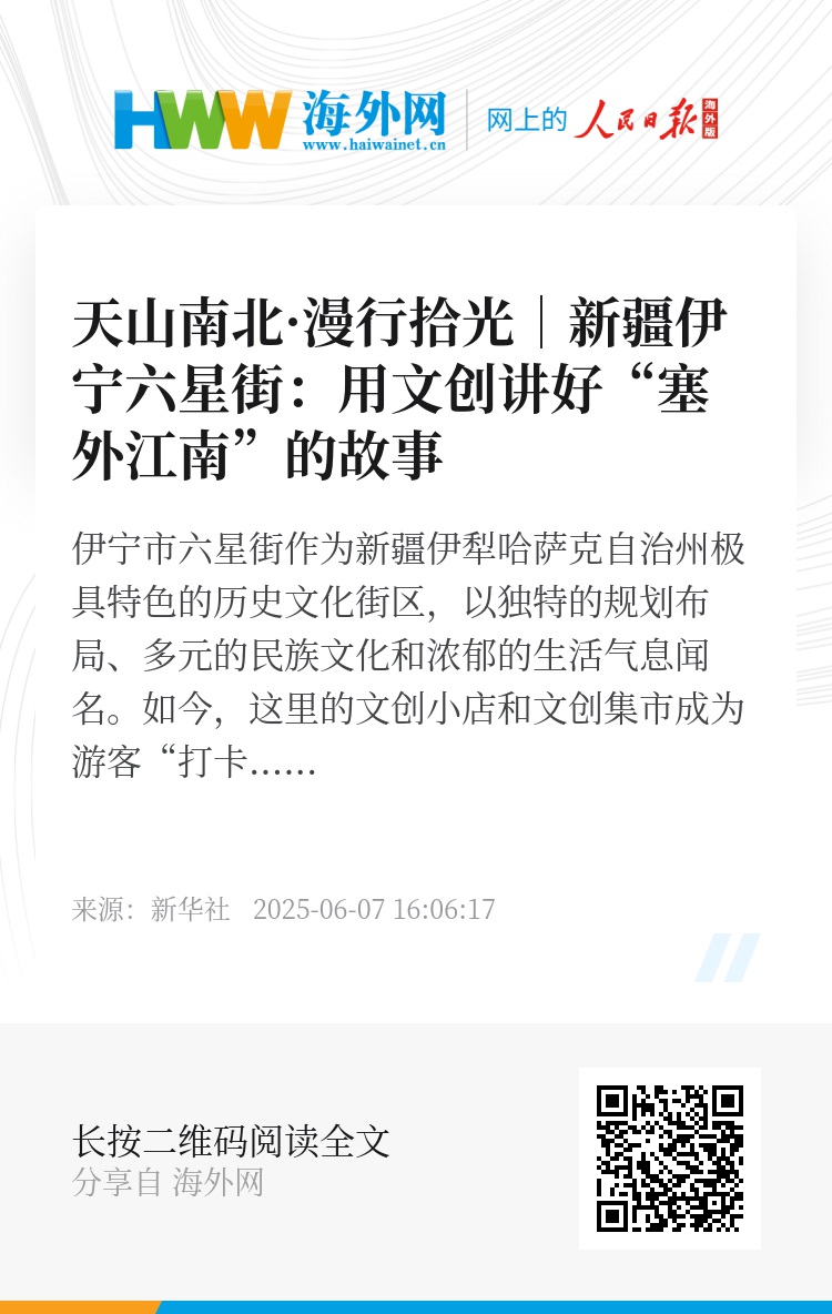 伊宁市六星街作为新疆伊犁哈萨克自治州极具特色的历史文化街区,以独特的规划布局、多元的民族文化和浓郁的生活气息闻名。如今,这里的文创小店和文创集市成为游客“打卡”热门地,“带走伊犁故事”的文创消费掀起新热潮。
