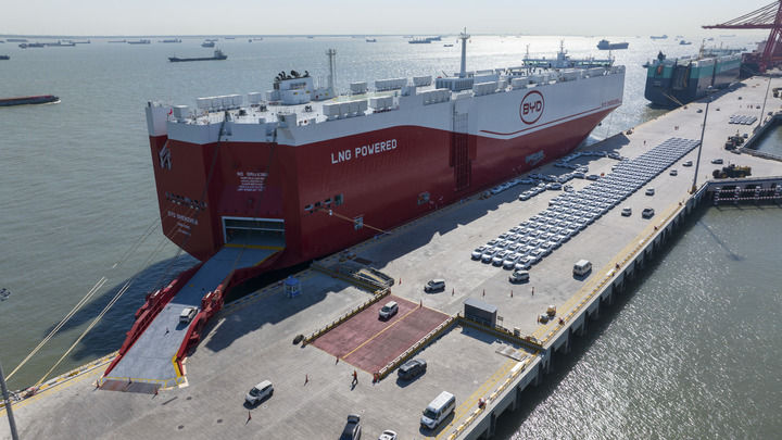 2025年4月26日,出口汽车在苏州港太仓港区码头集中装载上“深圳号”汽车运输船(无人机照片)。新华社发(王须中 摄)