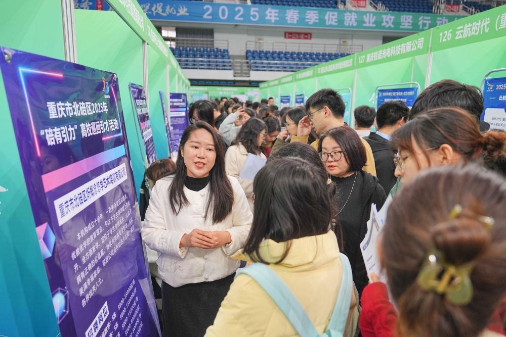 3月28日,西南大学应届毕业生在2025年春季促就业攻坚行动综合类双选会现场了解岗位信息。活动邀请装备制造、新能源、数字信息、绿色化工、基础教育、医疗卫生等行业领域企业参与,为毕业生搭建广阔多元的就业平台。新华社发(秦廷富摄)