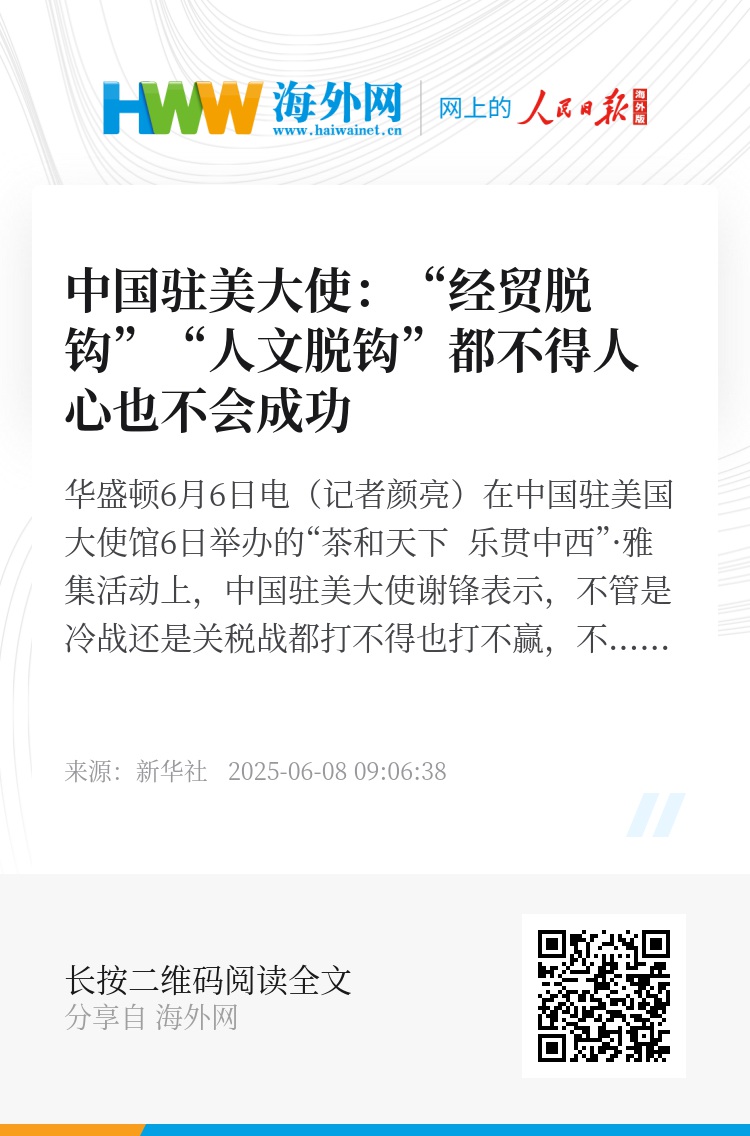 新华社华盛顿6月6日电(记者颜亮)在中国驻美国大使馆6日举办的“茶和天下 乐贯中西”·雅集活动上,中国驻美大使谢锋表示,不管是冷战还是关税战都打不得也打不赢,不管是经贸脱钩还是人文脱钩都不得人心也不会成功,不同国家、不同文明应当在彼此尊重中共同发展、在求同存异中合作共赢。