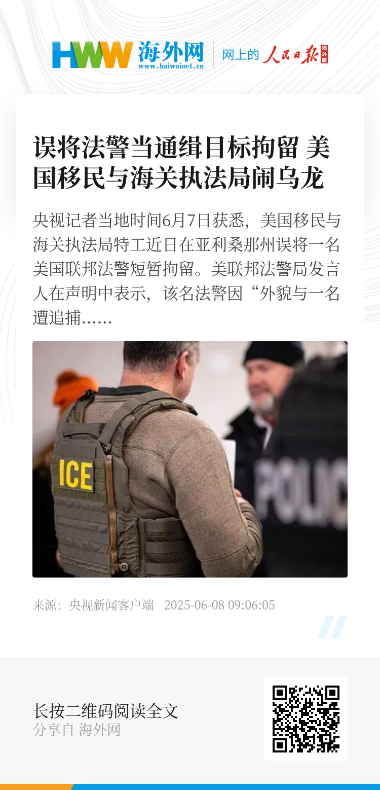 央视记者当地时间6月7日获悉,美国移民与海关执法局特工近日在亚利桑那州误将一名美国联邦法警短暂拘留。美联邦法警局发言人在声明中表示,该名法警因“外貌与一名遭追捕的嫌疑人相符”而在图森市一座联邦大楼大厅内被扣留。