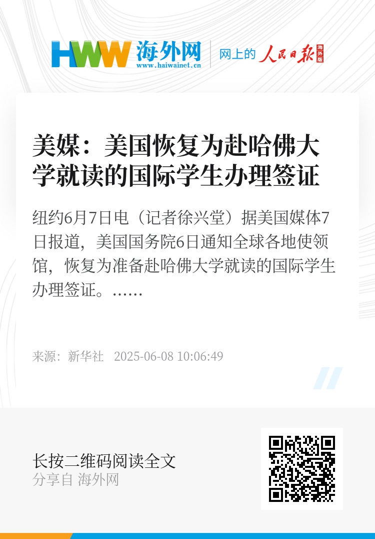 新华社纽约6月7日电(记者徐兴堂)据美国媒体7日报道,美国国务院6日通知全球各地使领馆,恢复为准备赴哈佛大学就读的国际学生办理签证。