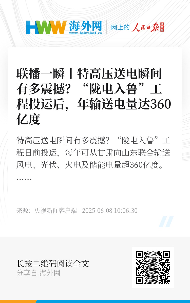 联播一瞬丨特高压送电瞬间有多震撼?“陇电入鲁”工程投运后,年输送电量达360亿度