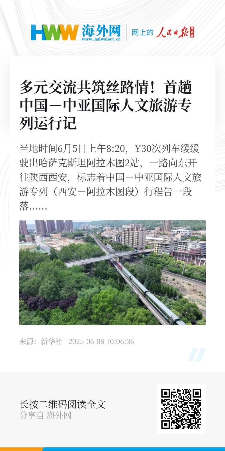 2025年是哈萨克斯坦“中国旅游年”。中国-中亚国际人文旅游专列(西安-阿拉木图段)的开行,为深化中国与中亚国家互联互通、促进人文交流开辟了新通道。此专列对于推动中哈两国在交通运输“硬联通”、旅游服务“软联通”、人文交流“心联通”方面,具有重大时代意义,既重现了两国友好交往的历史胜景,更勾勒出双方携手走向共同繁荣的美好蓝图。
