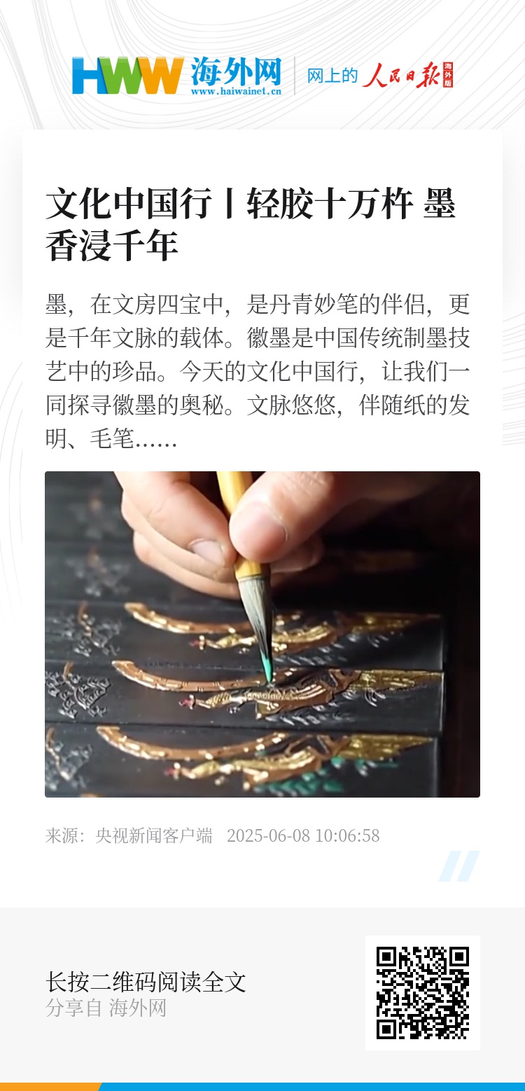 墨,在文房四宝中,是丹青妙笔的伴侣,更是千年文脉的载体。徽墨是中国传统制墨技艺中的珍品。今天的文化中国行,让我们一同探寻徽墨的奥秘。
