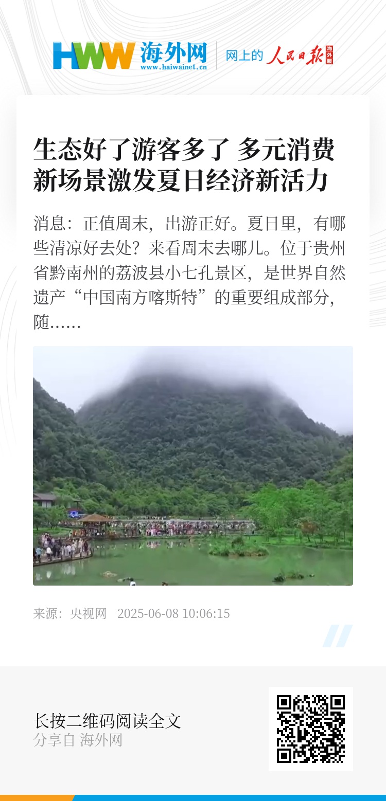 小七孔景区拥有独特的喀斯特地貌,形态各异的石峰拔地而起,清澈见底的溪流贯穿景区,广袤茂密的原始森林遮天蔽日,森林覆盖率超过92%,漫步其间,清新的空气裹挟着草木的芬芳扑面而来,超高的负氧离子含量,让这里成为名副其实的天然绿色氧吧。凭借得天独厚的生态资源,小七孔景区的吸引力持续攀升。今年以来,景区共接待游客176.06万人,同比增长7.81%。越来越多的游客慕名而来,沉醉于荔波的山水之间,感受生态之美,享受夏日清凉。