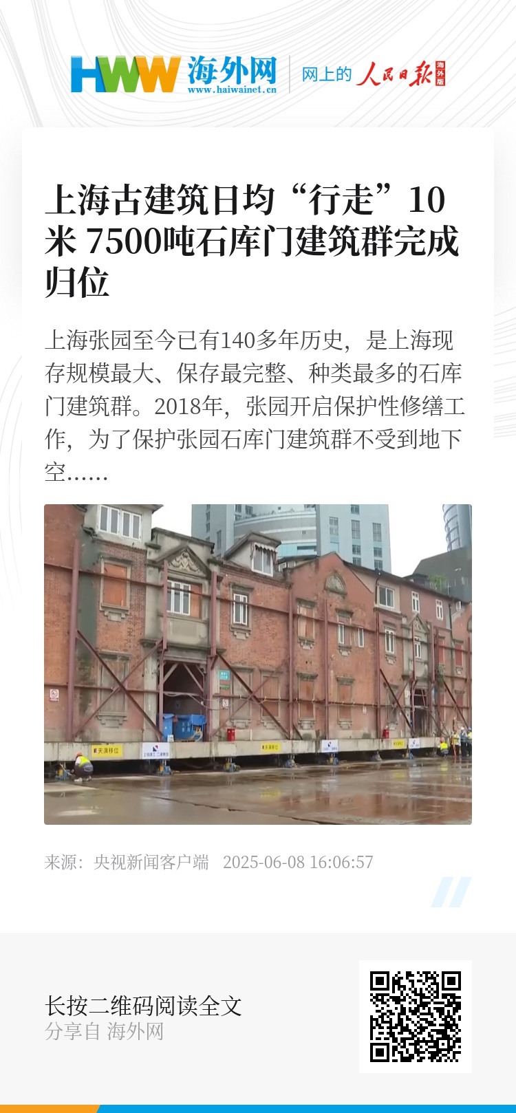 总台记者 宁婉婷:一走进张园东区,最醒目的连片石库门就是我身后的“华严里”。通过一段延时画面可以看到整个建筑归位的过程,从5月19日启动归位以来,“华严里”以日均10米的速度“行走”,现在,整体归位已经完成。