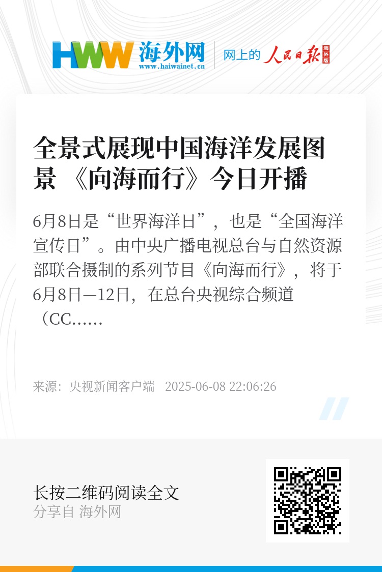 6月8日是“世界海洋日”,也是“全国海洋宣传日”。由中央广播电视总台与自然资源部联合摄制的系列节目《向海而行》,将于6月8日—12日,在总台央视综合频道(CCTV-1)18:20档开播,央视频、央视网同步上线。