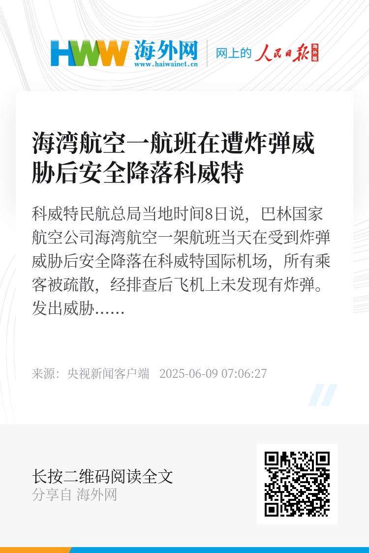 科威特民航总局当地时间8日说,巴林国家航空公司海湾航空一架航班当天在受到炸弹威胁后安全降落在科威特国际机场,所有乘客被疏散,经排查后飞机上未发现有炸弹。发出威胁的嫌疑人已被当局逮捕。