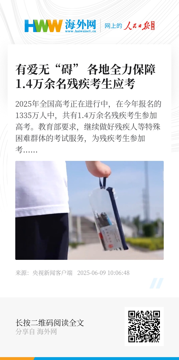 2025年全国高考正在进行中,在今年报名的1335万人中,共有1.4万余名残疾考生参加高考。教育部要求,继续做好残疾人等特殊困难群体的考试服务,为残疾考生参加考试提供合理便利。