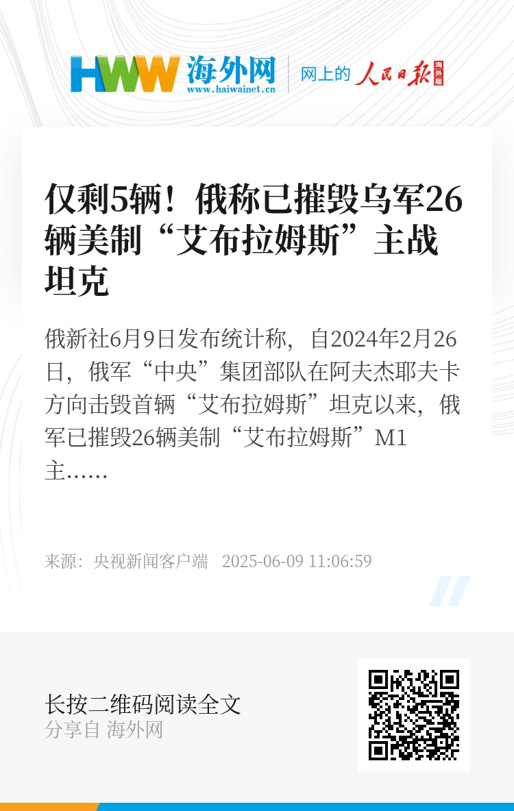俄新社6月9日发布统计称,自2024年2月26日,俄军“中央”集团部队在阿夫杰耶夫卡方向击毁首辆“艾布拉姆斯”坦克以来,俄军已摧毁26辆美制“艾布拉姆斯”M1主战坦克。鉴于2023年1月时任美国总统拜登宣布一共向乌克兰提供31辆该型号坦克,按此计算,乌军现仅存5辆该型坦克。
