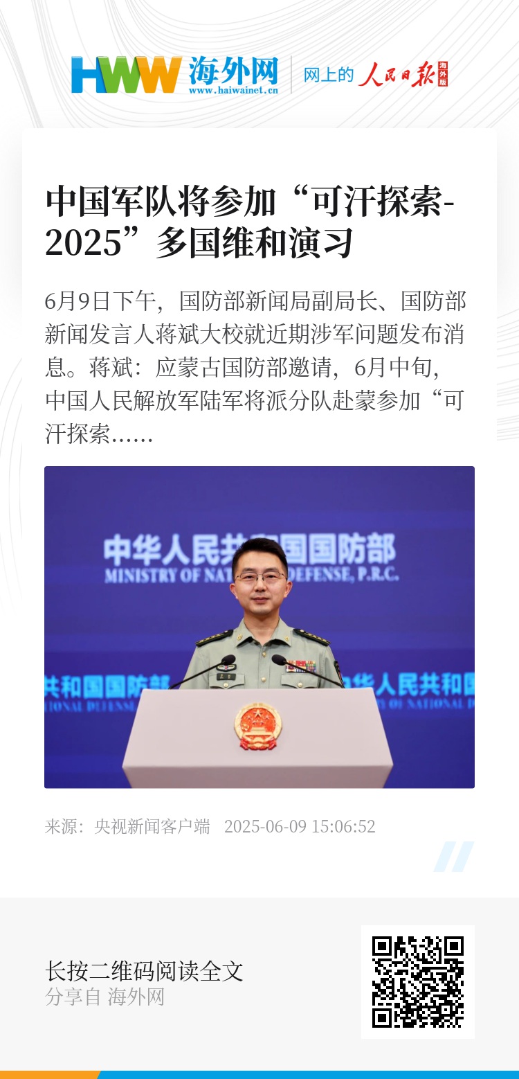 蒋斌:应蒙古国防部邀请,6月中旬,中国人民解放军陆军将派分队赴蒙参加“可汗探索-2025”多国维和演习。